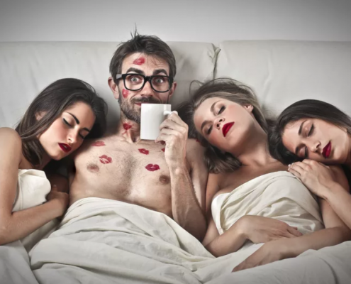– секс с две или повече жени. Тази фантазия е доста популярна. Тук мъжът е център на внимание, а прекрасните нимфи са заети само с това как да му доставят удоволствие. Колкото повече участнички, толкова по-страхотен се чувства мъжът. Нещо като потвърждение на „Аз мога да ги удовлетворя, аз съм готин, аз съм мъжкар”. Тази фантазия е лесна за реализация, когато още няма семейство и деца и не се подлагат на риск стабилни отношения, изключение правят случаите, когато това е фантазията и на двамата съпрузи.